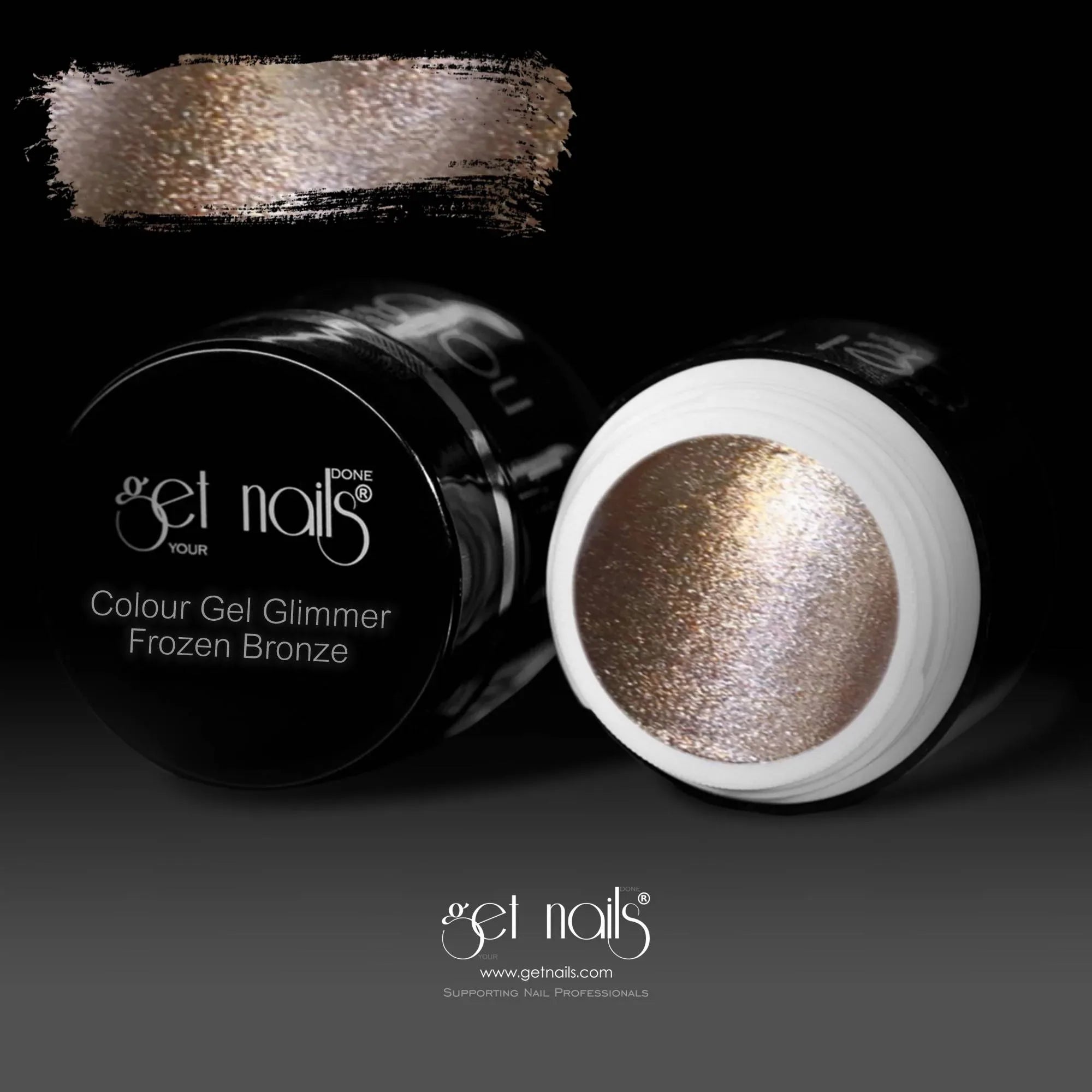 Colour Gel Glimmer Frozen Bronze 5g de la GET NAILS este un gel colorat profesional cu efect glimmer, ideal pentru manichiuri sofisticate cu un finisaj metalic si stralucitor.